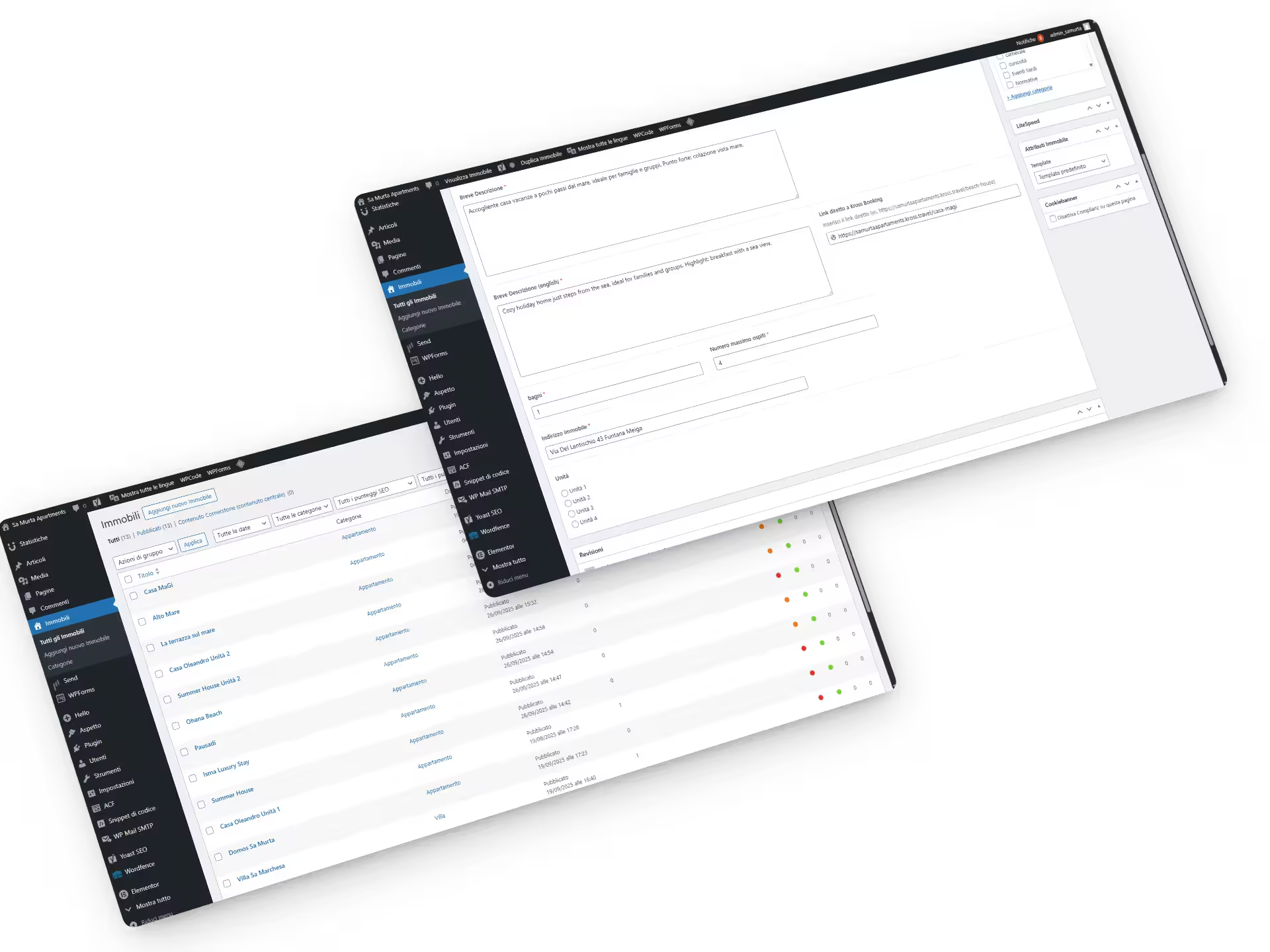 Gestione appartamenti su misura che rende l'aggiornamento dei contenuti veloce quanto compilare un modulo. Ogni appartamento ha i suoi campi specifici — esempio prezzi, gallery, dotazioni — ciò garantisce la facilità d'uso senza il rischio di compromettere il design o le prestazioni tecniche del sito.